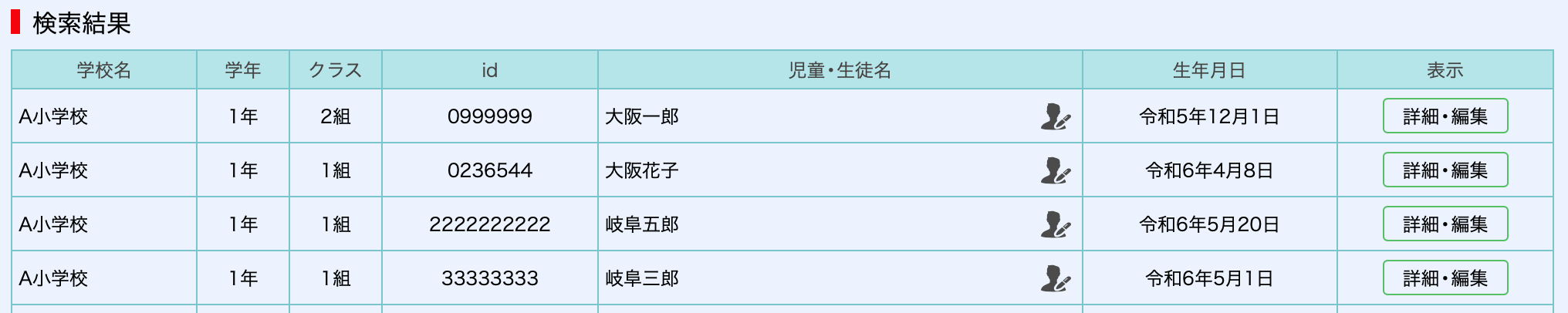 | 児童・生徒情報 | ID、児童・生徒名、生年月日、学年、クラスID、児童・生徒名、生年月日、学年、クラス ※氏名は50文字以上可(外国籍) ※俗名登録可能(印刷物対応) 市内転校、転入、転出管理 |