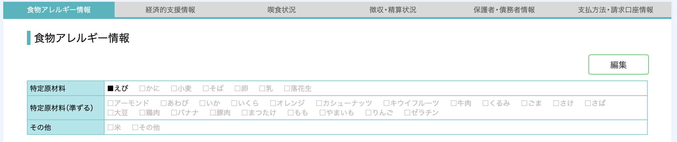 | 食物アレルギー情報 | 食物アレルギー情報を個人ごとに管理し、対象者一覧を表示します。 ※牛乳なしなどは個人メニューで管理しています。 |