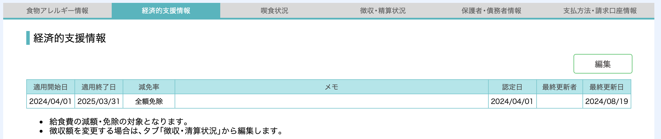 | 経済的支援情報 | 要保護や就学支援情報を管理し、認定期間中の給食費を減額します。 ※認定期間を管理し精算時で明細が表示されます。 ※最終期で精算されますが、各期の徴収額を変更することもできます。 |