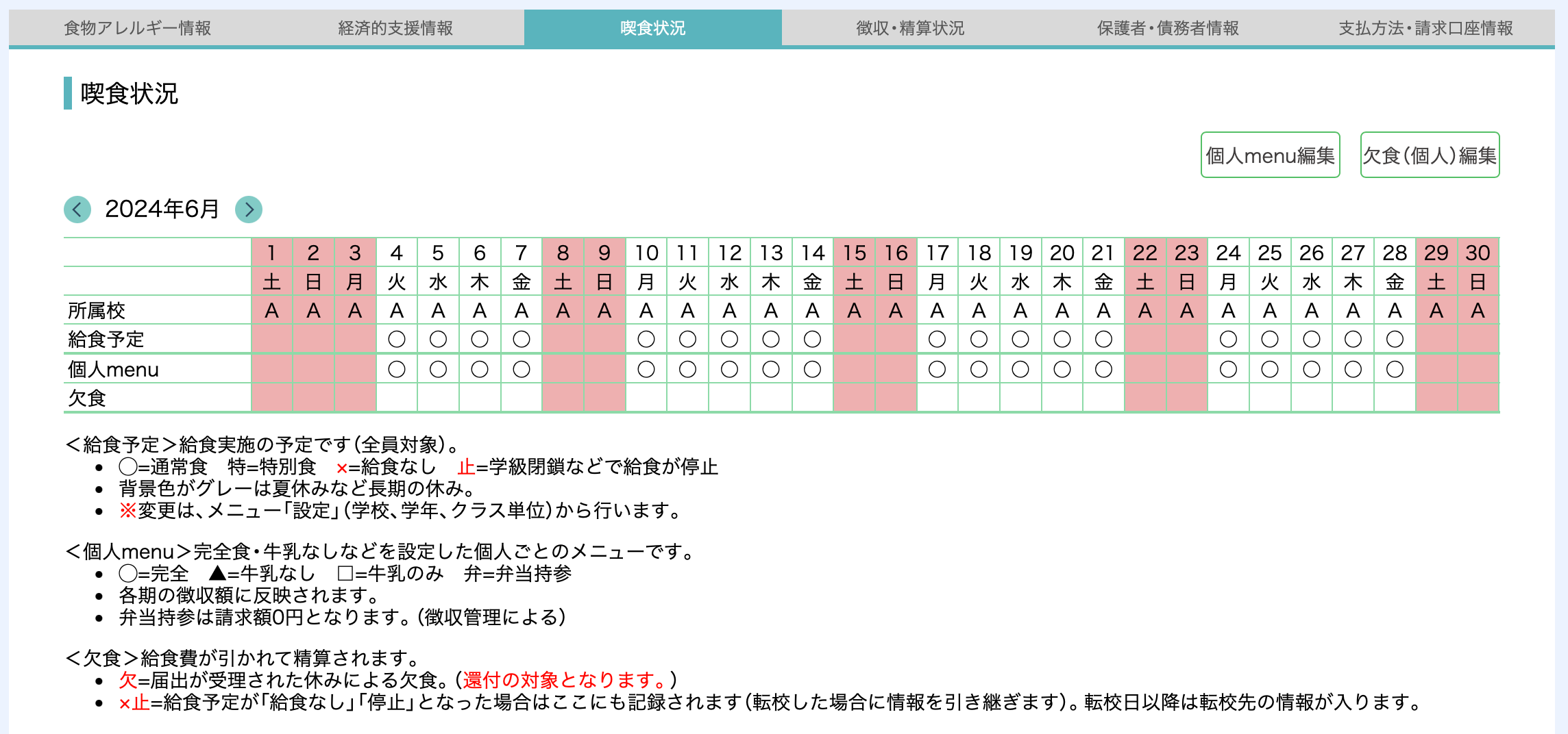 | 喫食状況 | ①個人メニュー管理(弁当持参、牛乳なしなど) ②届出による給食なし期間設定 ※メニュー期間を管理し精算時で明細が表示されます。 ※最終期で精算されますが、各期の徴収額を変更することもできます。 |