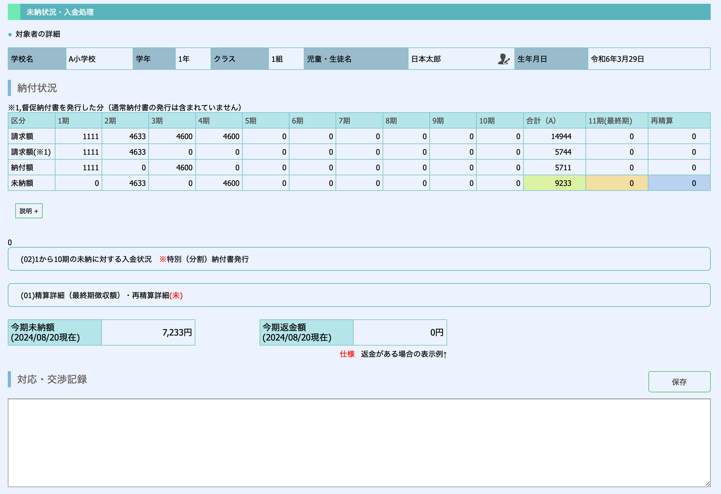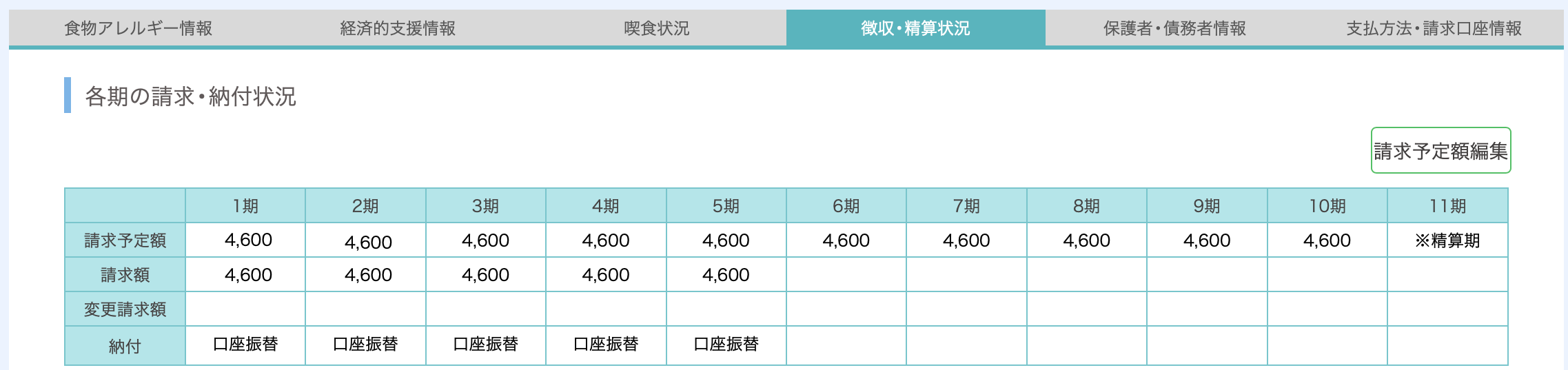 | 請求額 | ①定額徴収(1期から最終期、最終期で精算) ②経済的支援は精算期で調整 ※要保護・準要保護(就学支援)、長期休学など個別に徴収額を0円設定可能 |