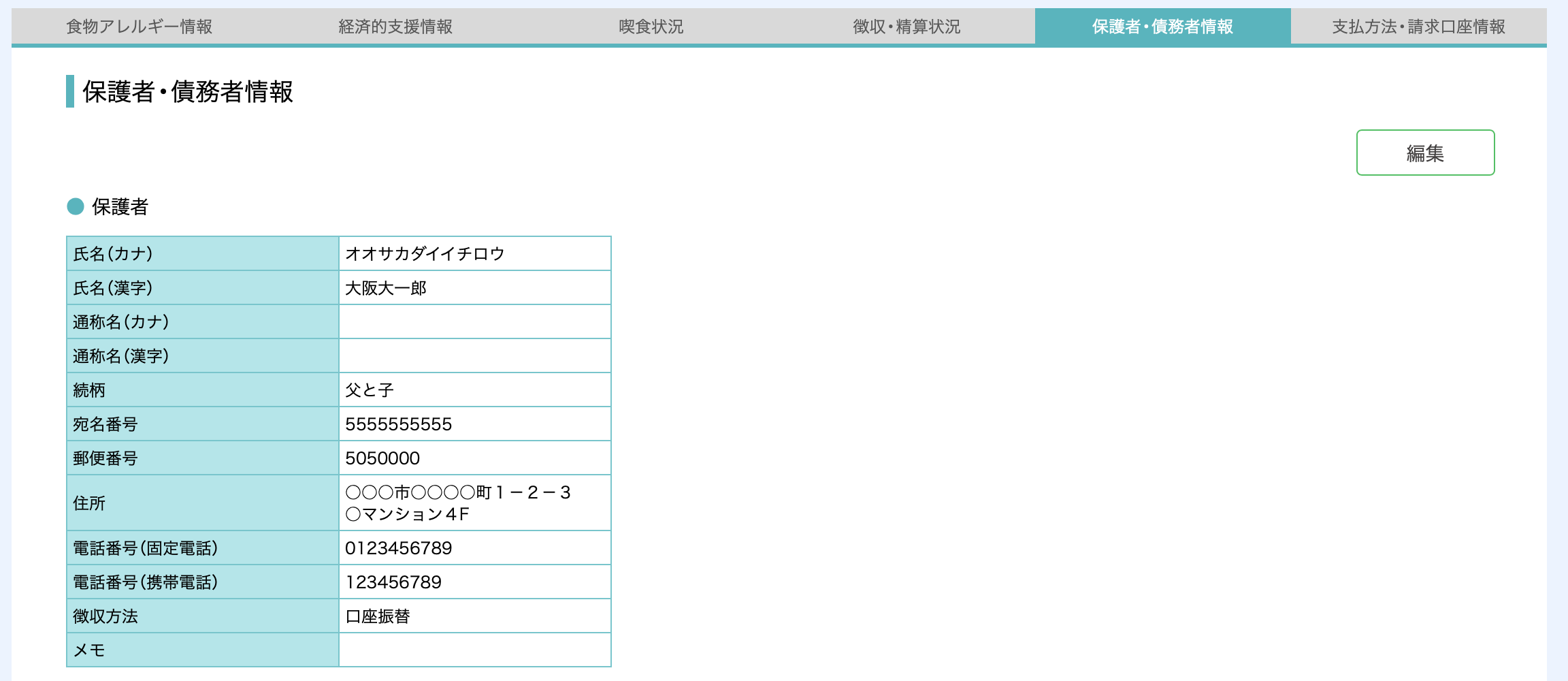 | 保護者(債務者)情報 | 氏名、住所、電話、納付方法 ※氏名は50文字以上可(外国籍) ※俗名登録可能(印刷物対応) ※銀行口座振替、納付書請求の管理 |