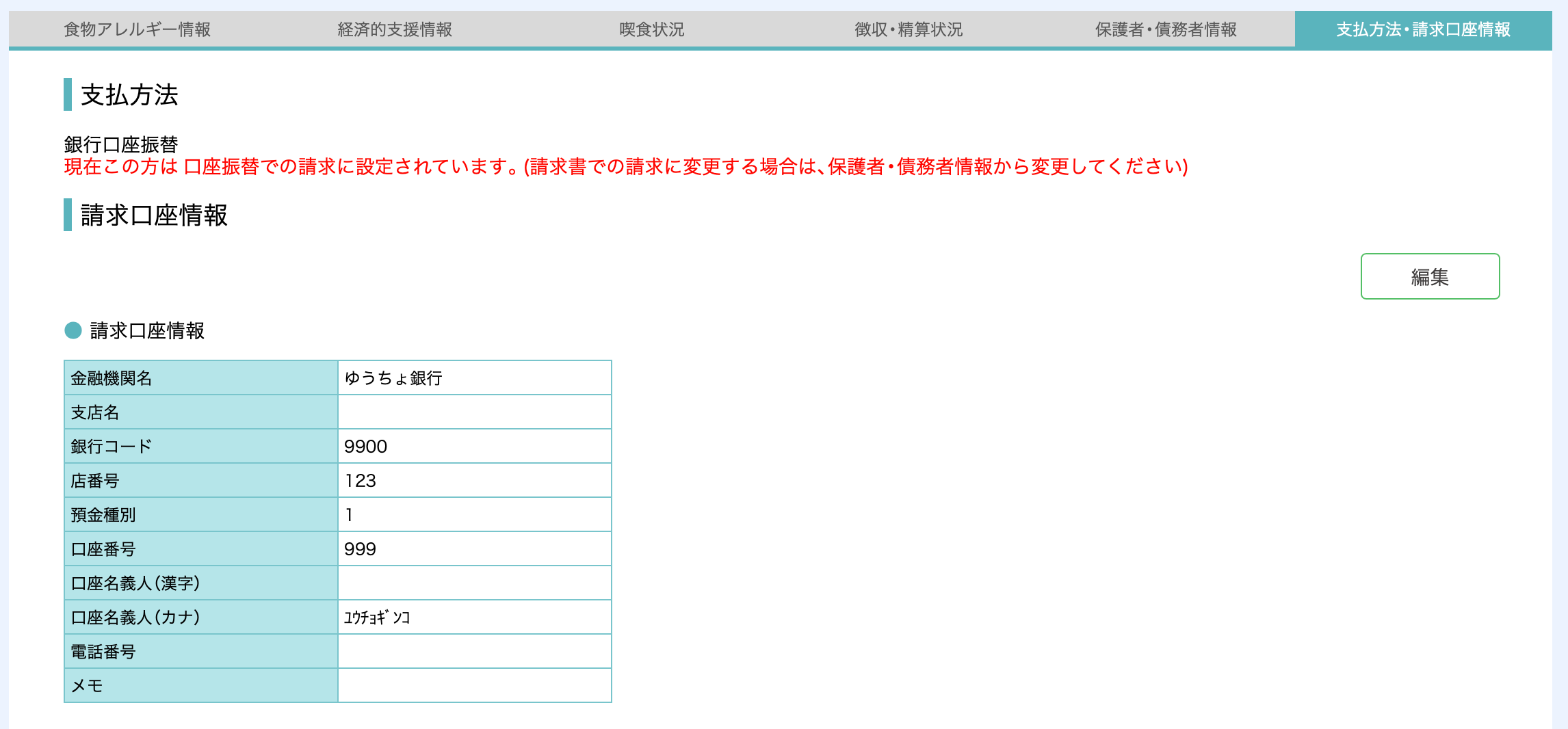 | 支払方法・請求口座情報 | 請求・還付用の銀行口座情報 |