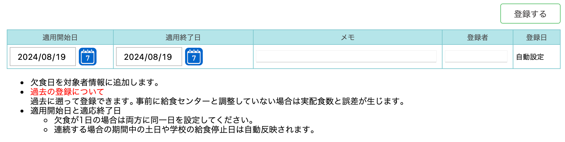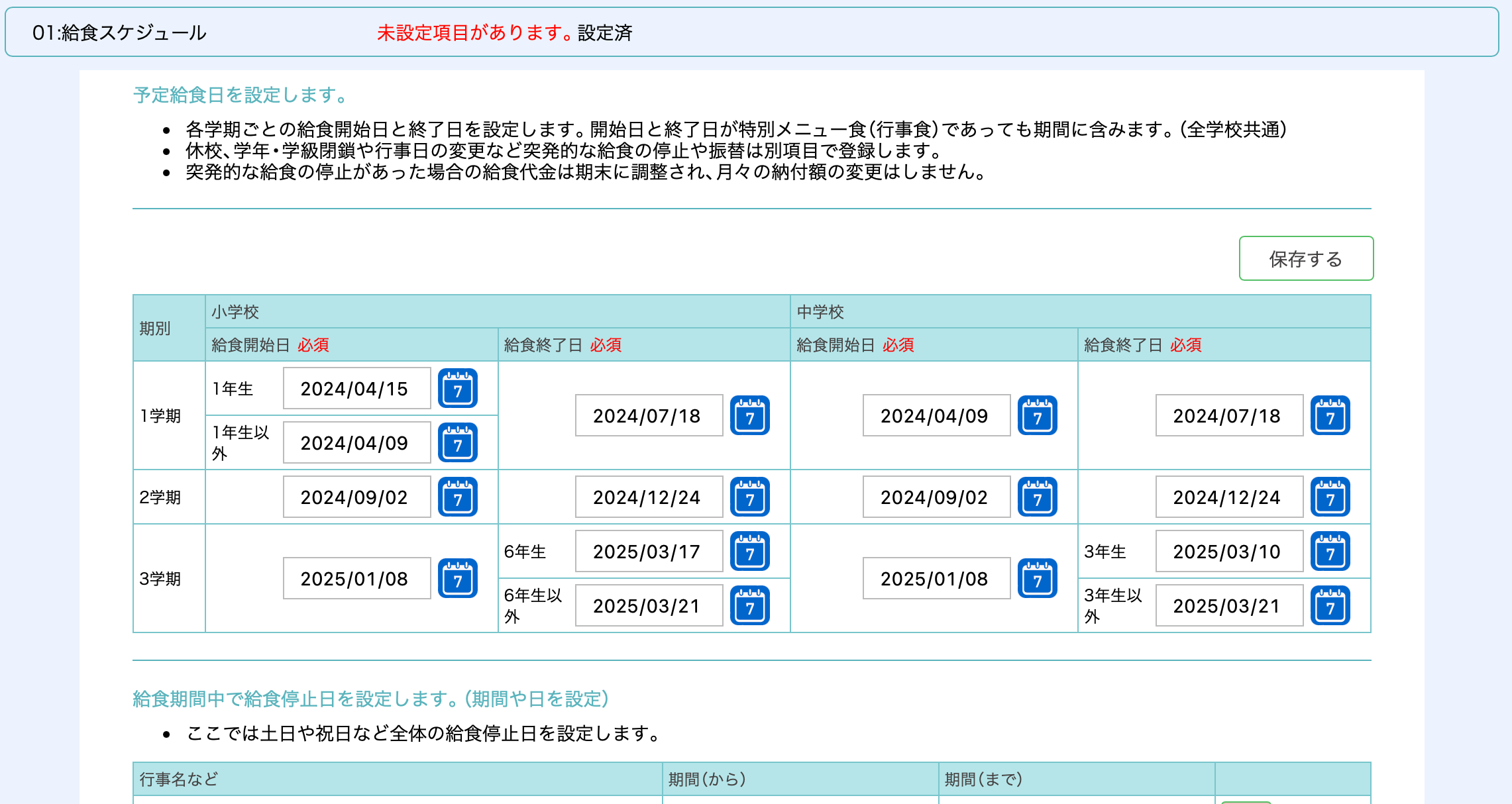 | 給食数管理 | ①給食期間設定 ②行事・閉鎖など給食停止管理 ③通常食・行事食管理 |