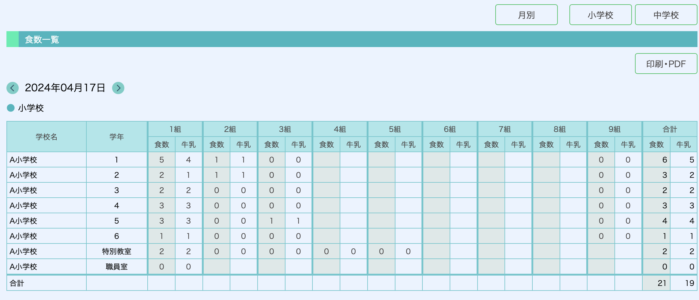 | 配食数管理(学校、学年、クラス別集計) 日別・月別表示 |