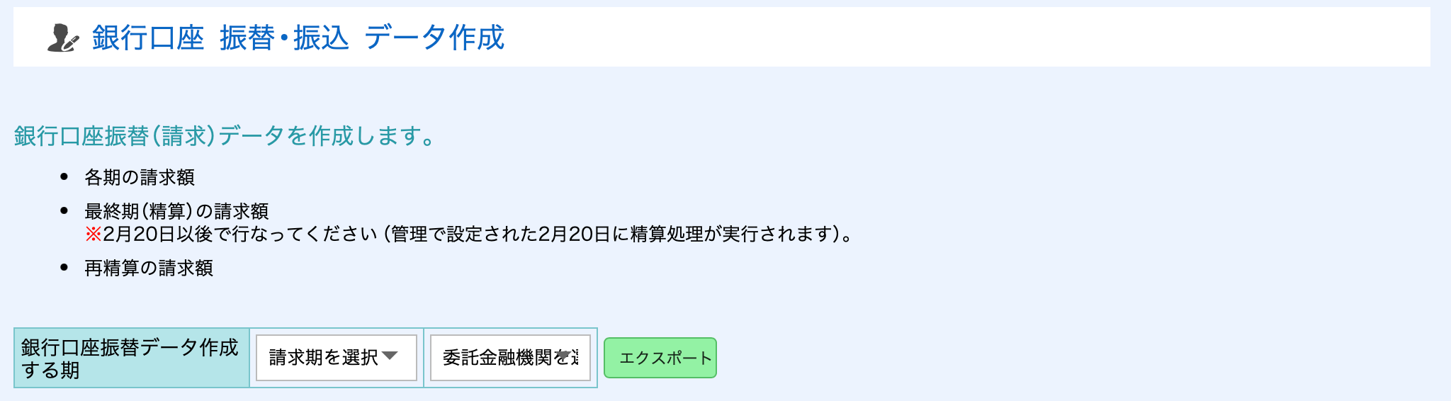 | 請求方法 | 銀行口座振替(銀行フォーマット出力) ※要保護・準要保護(就学支援)、長期休学など個別に徴収額を0円設定可能 |