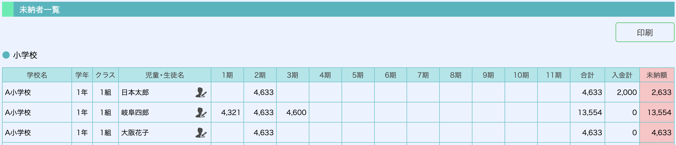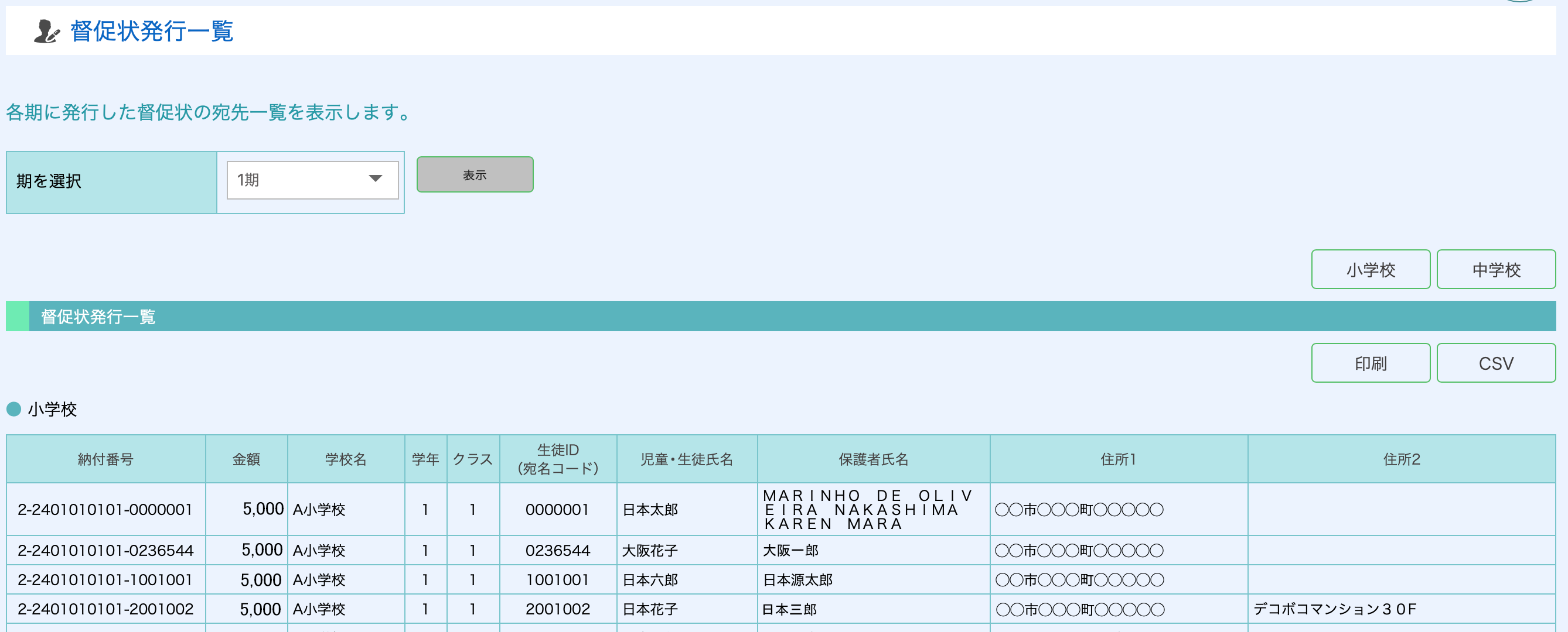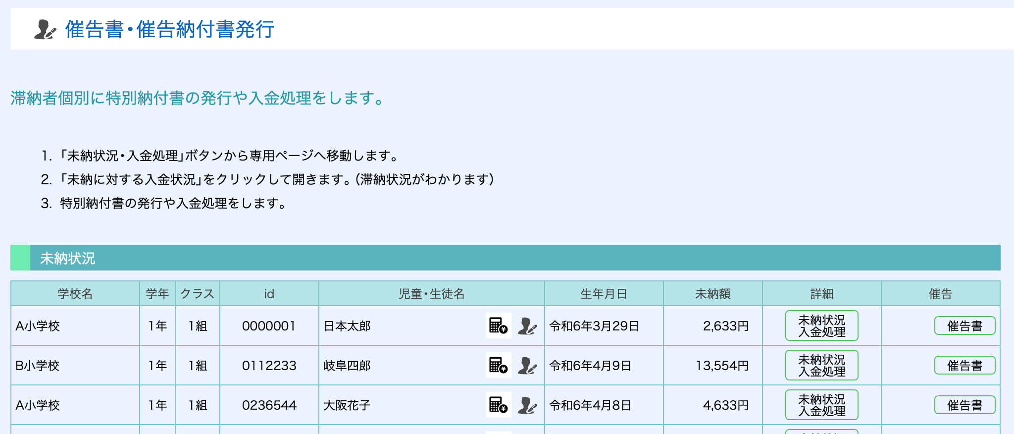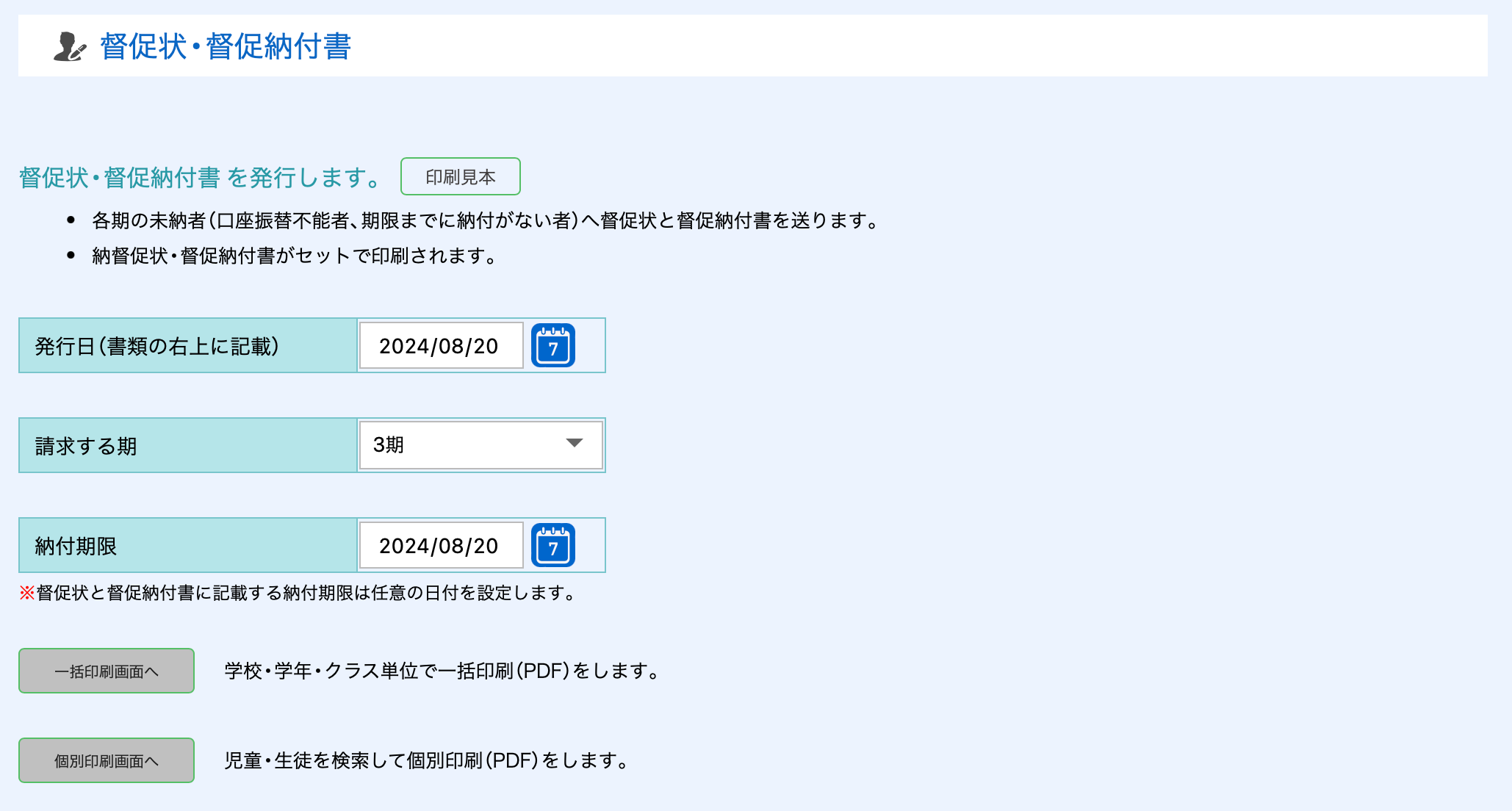 | 督促納付書発行 | 対象者一覧から、個人ごと、クラス単位、学年・学校単位に印刷 |