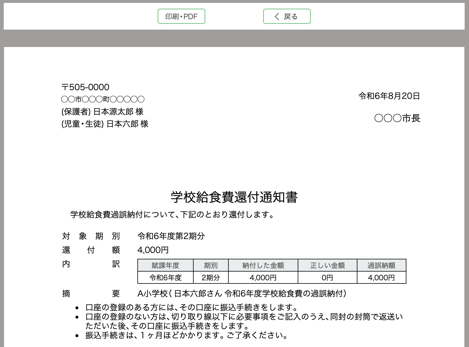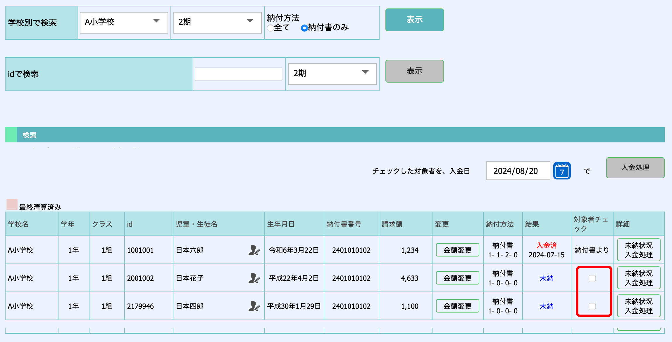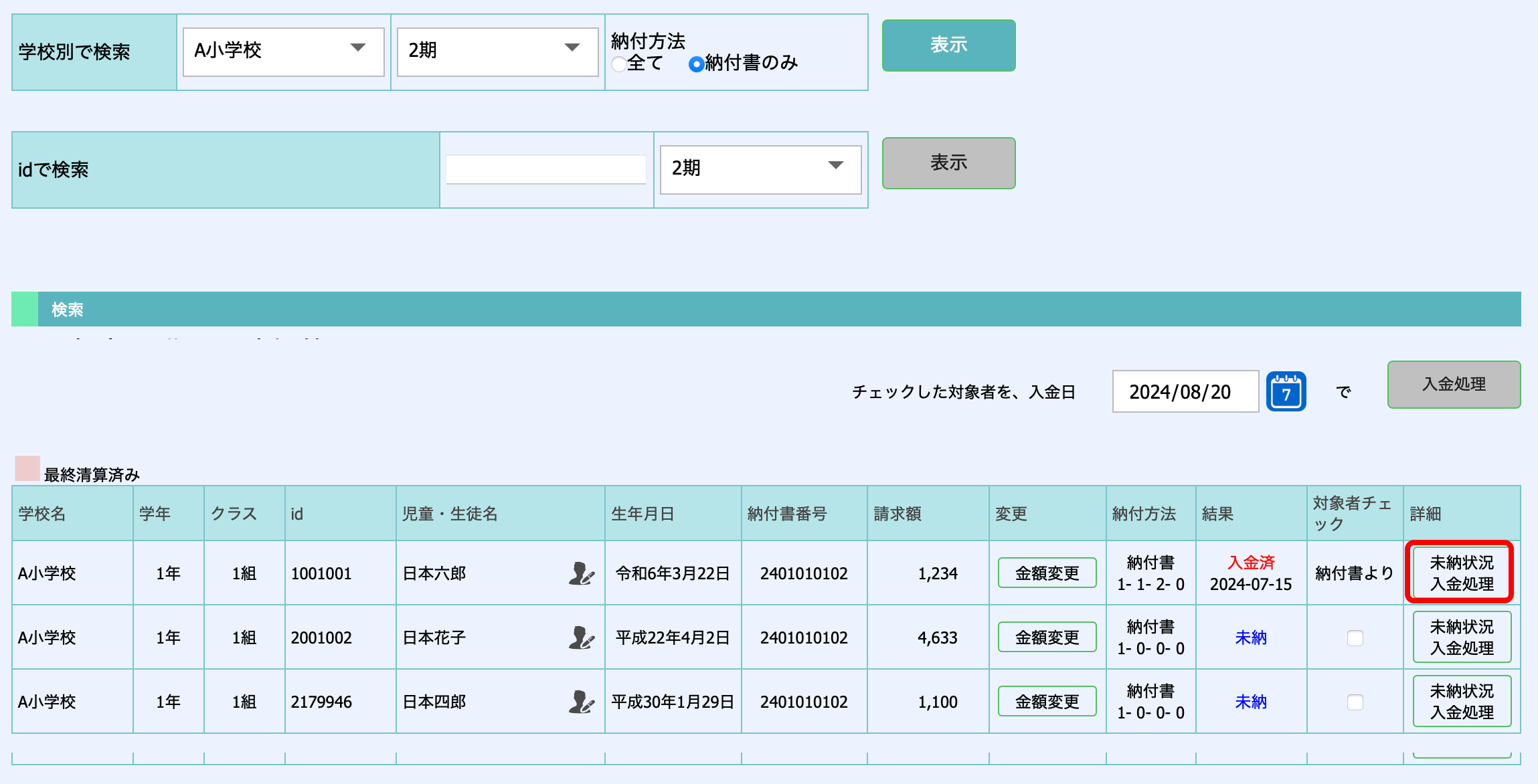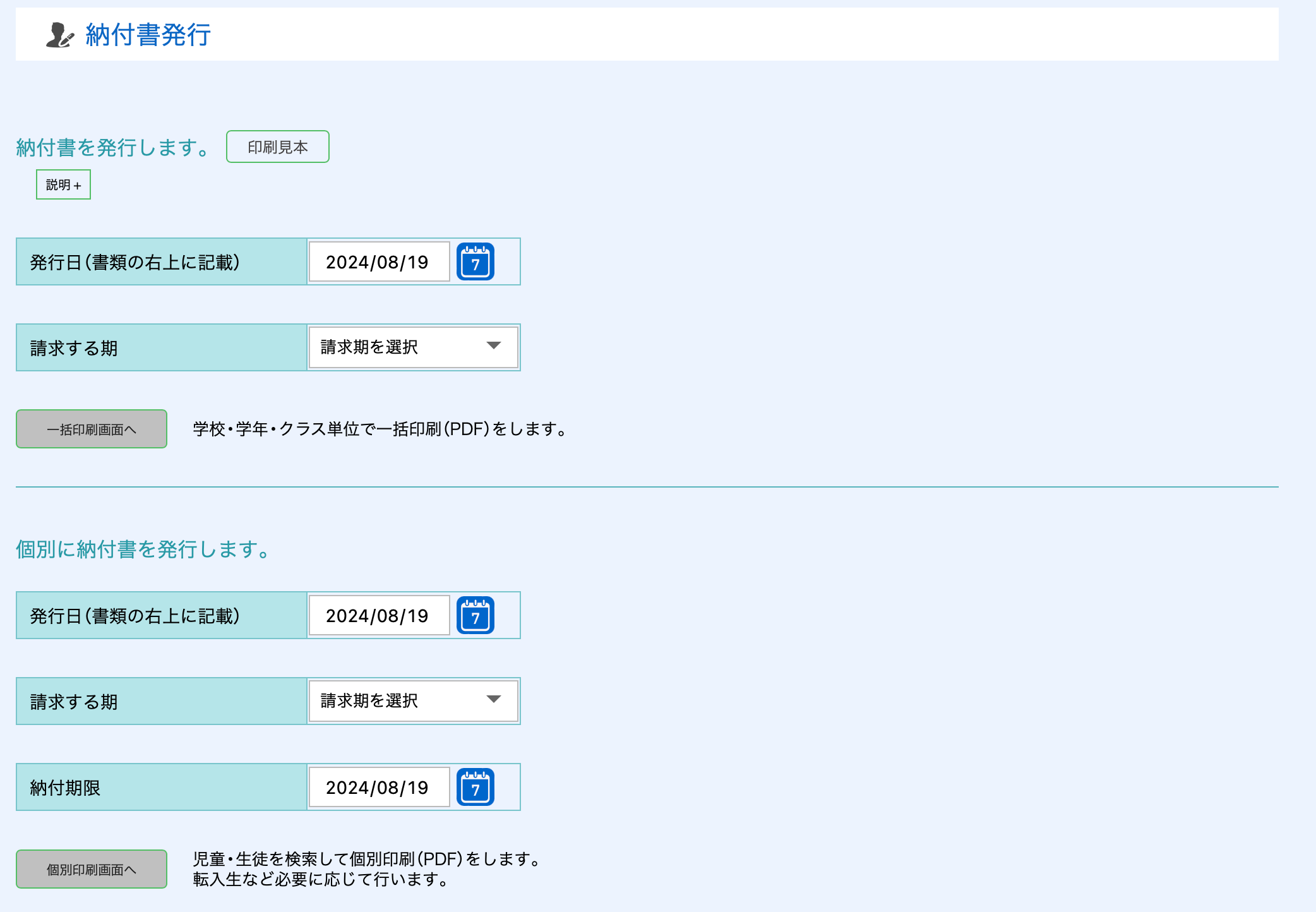 | 督促納付書発行 | 対象者一覧から、個人ごと、クラス単位、学年・学校単位に印刷 |