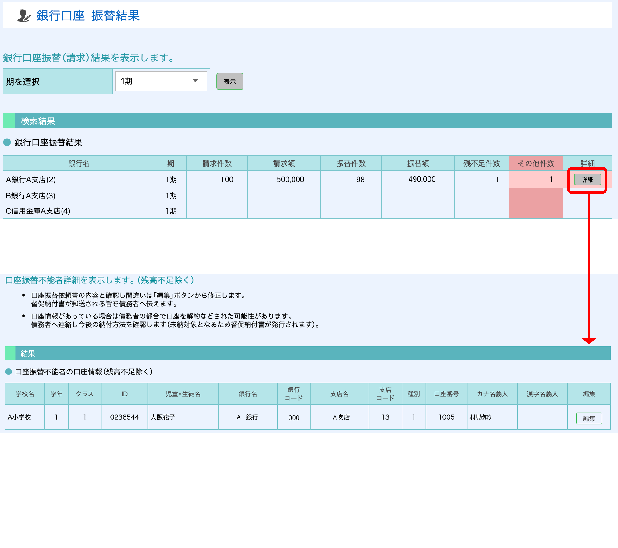 | 口座振替不能者一覧 | 振替件数、金額、残高不足件数、振替不能(※)件数を表示 ※口座番号登録間違いや口座解約などによる振替不能者の情報表示 |