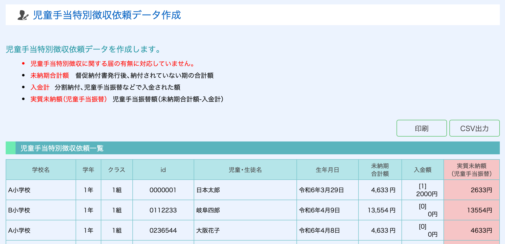 | 未納者一覧 | 未納額がある対象者の一覧(各期の未納額と合計を表示。分納や児童手当振替額を含めた実質未納額を算出) |