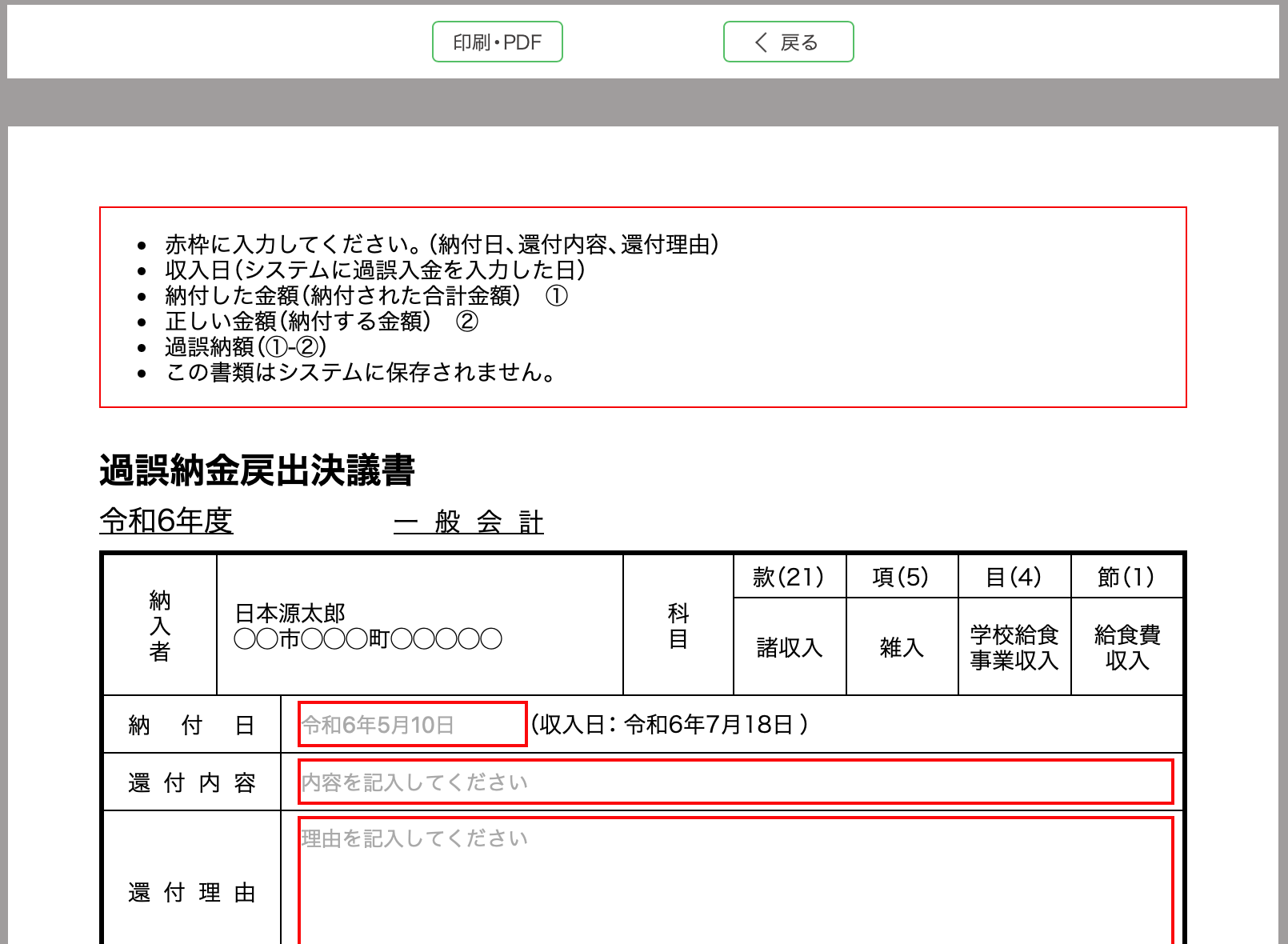| 過誤納金戻出決議書印刷(必要情報が記載されて印刷) |