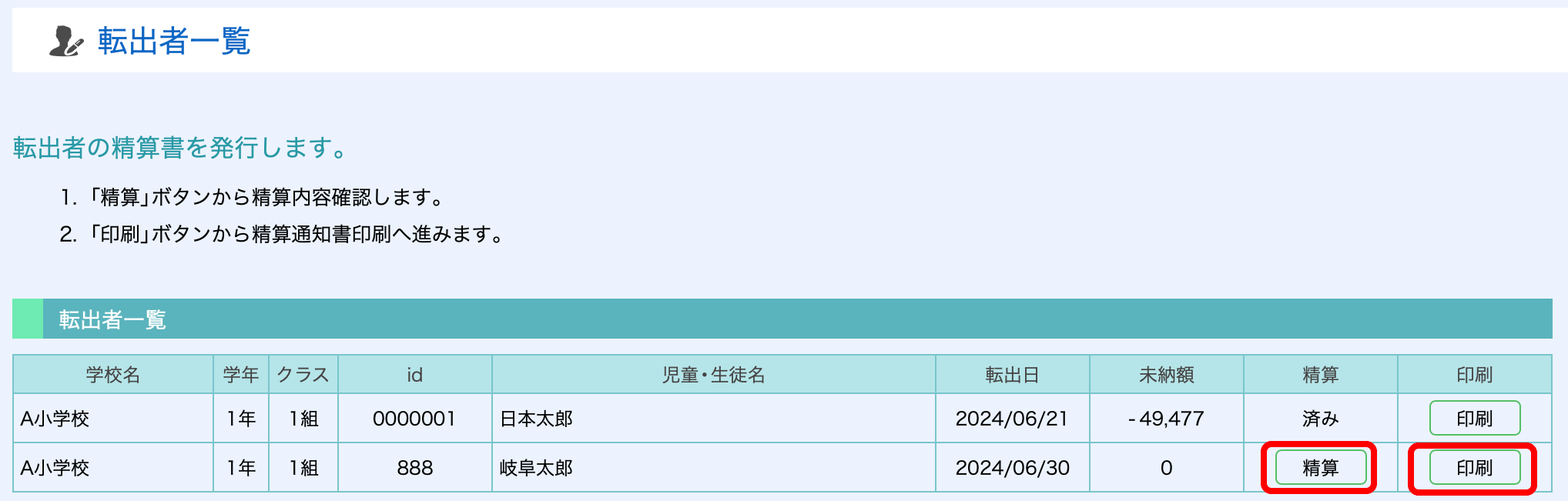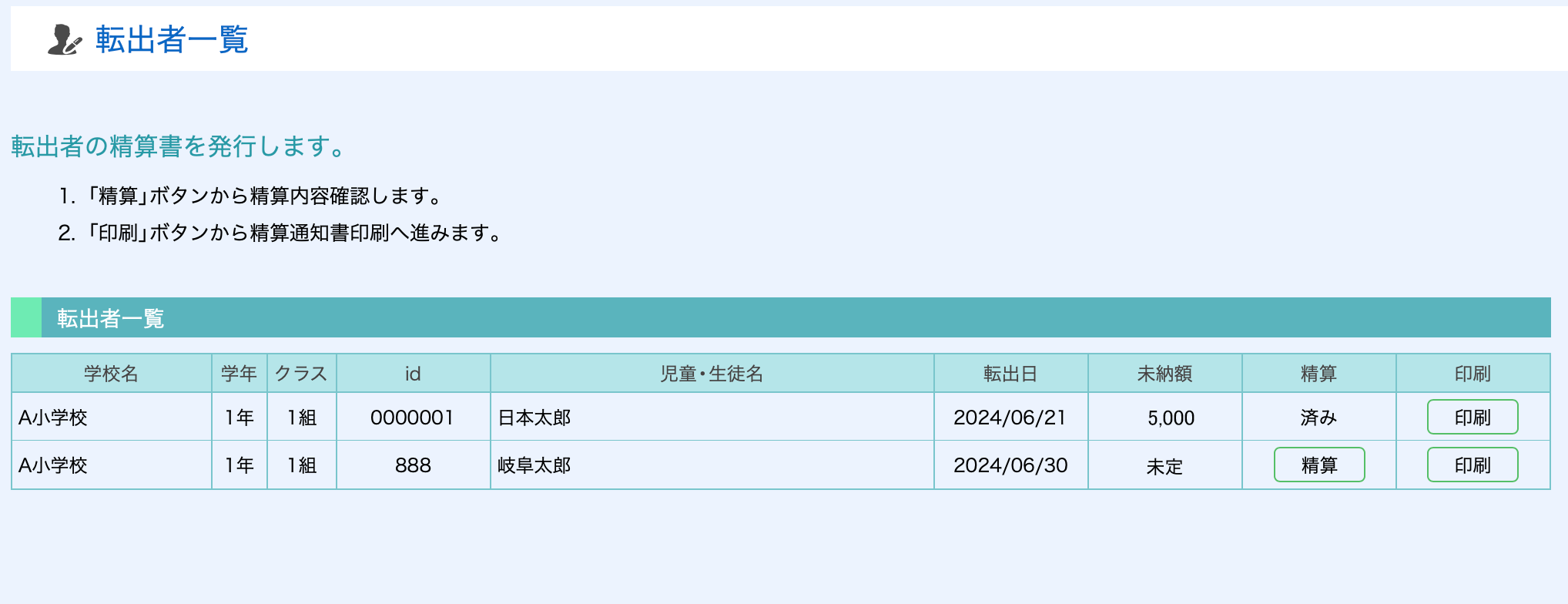 | 転出者一覧 | 給食費の精算額を確定し請求・還付処理 |