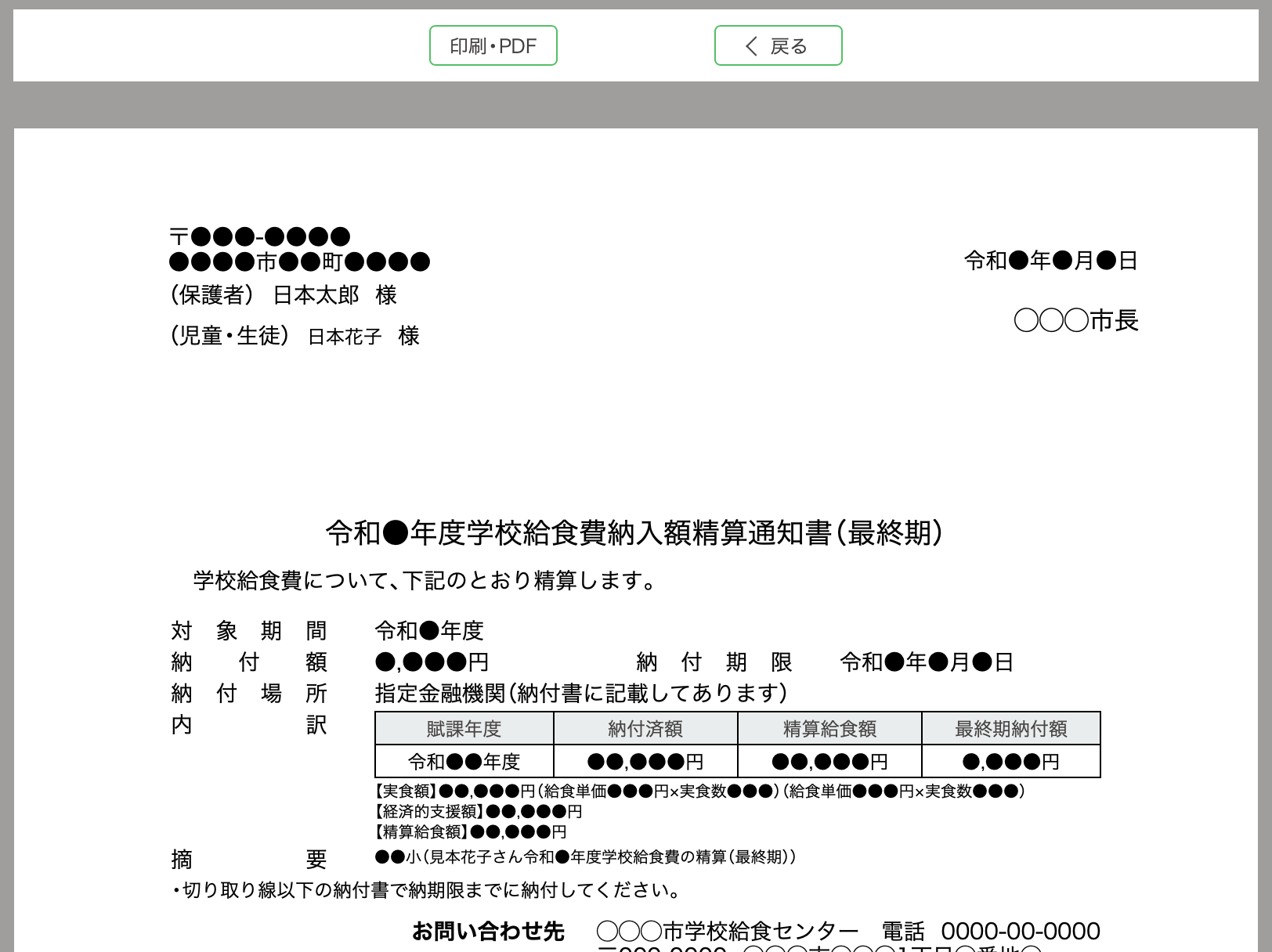 | 納付書送付(案内文と納付書)※市様式による。一括・個別印刷 ※要保護・準要保護(就学支援)、長期休学など個別に徴収額を0円設定可能 |
