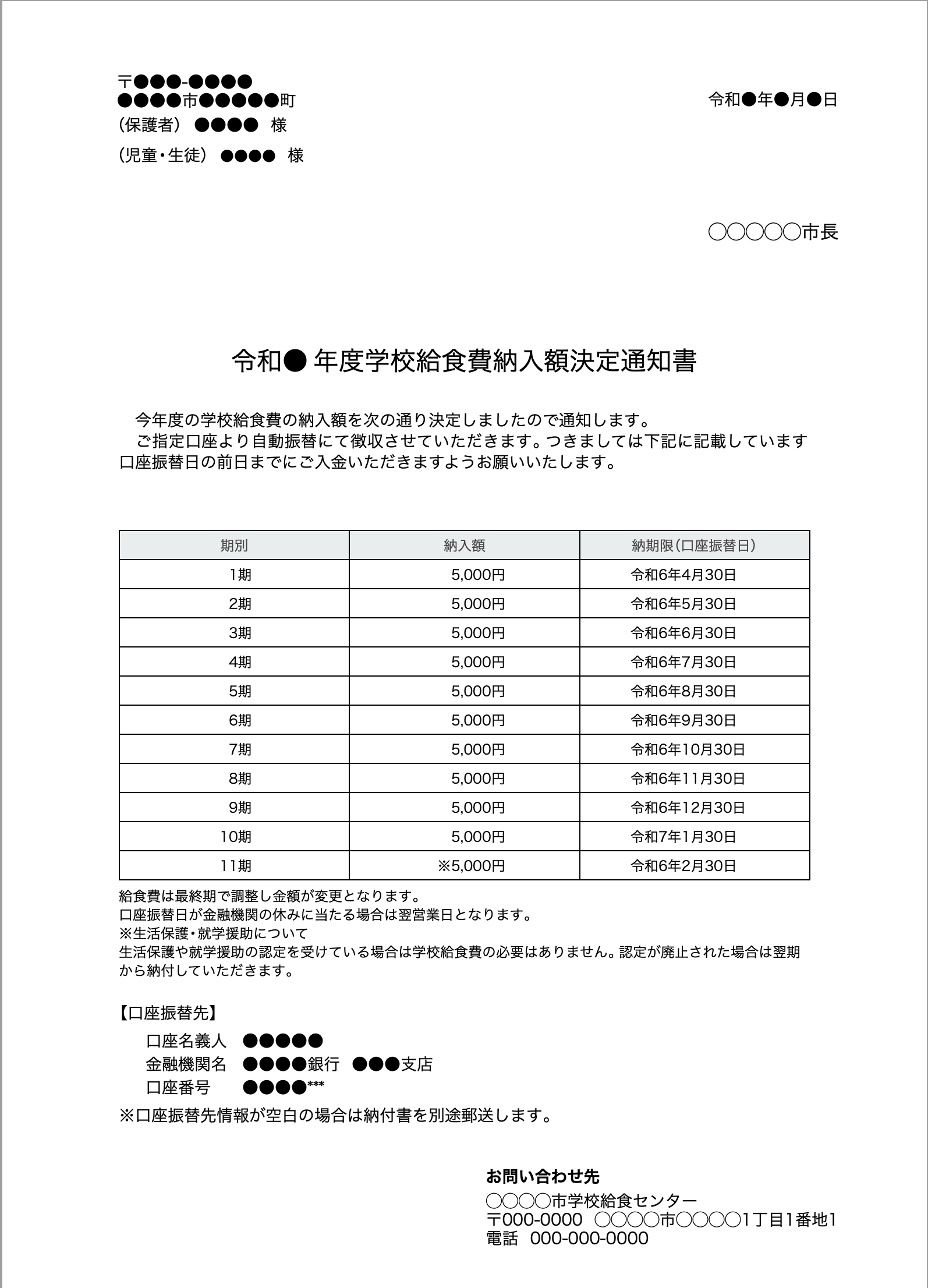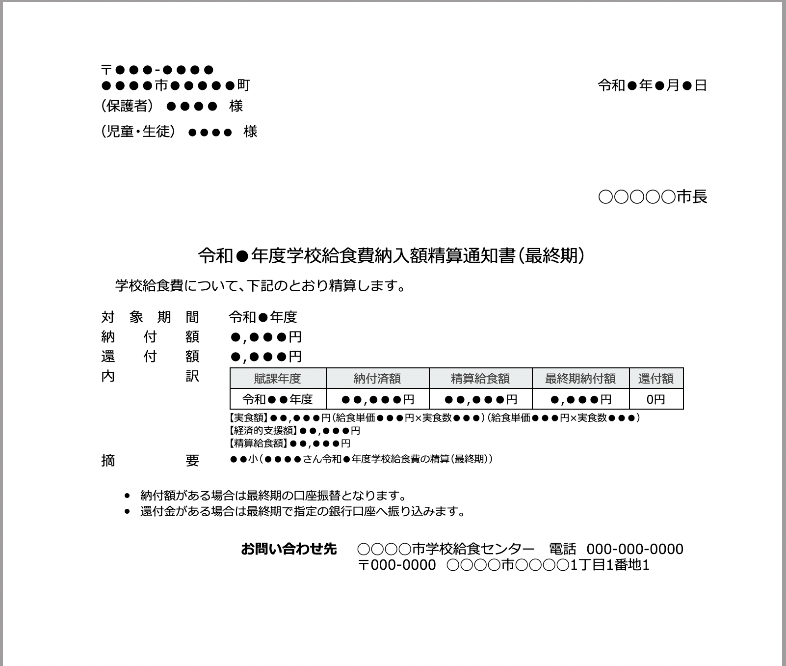 | 年間納入額精算通知書 | 最終期で精算を行う場合の通知書(精算明細、最後の口座振替額記載) |
